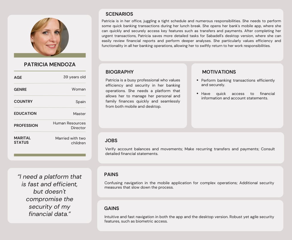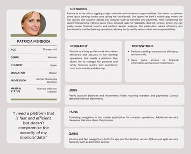 This archetype represents busy professionals like Patricia Mendoza, a Human Resources Director who needs to manage her finances quickly and securely. Patricia values efficiency and functionality in banking operations. She uses the mobile app for quick transactions and the desktop version for more detailed tasks. She seeks a banking platform with intuitive and efficient navigation, as well as robust yet seamless security features that do not disrupt her workflow.
