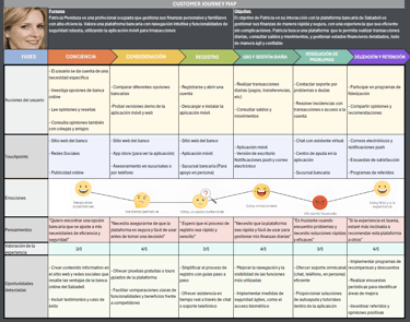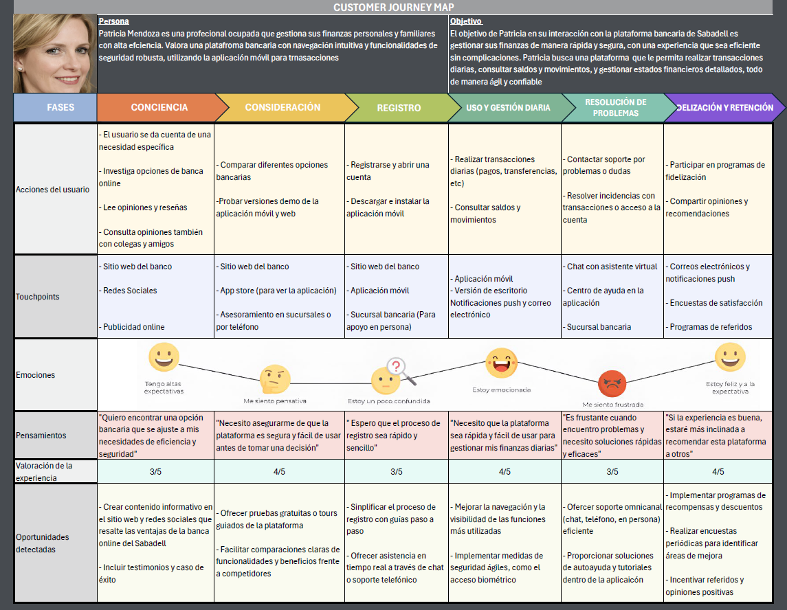 The customer journey map was developed from a holistic perspective, aiming to provide a detailed description of how the client experiences their relationship with Sabadell. This tool is used to diagnose the customer experience, drive innovation in this area, and set priorities in situations with limited resources, thereby identifying the key areas that require focus.